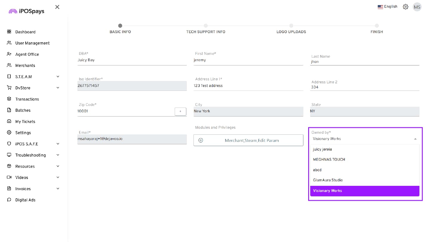 In the Merchant Info section, locate the Owner field and select the appropriate Agent Office or Sub Agent Office from the drop-down list. If Agent Offices are not configured, this field will default to the ISO name.