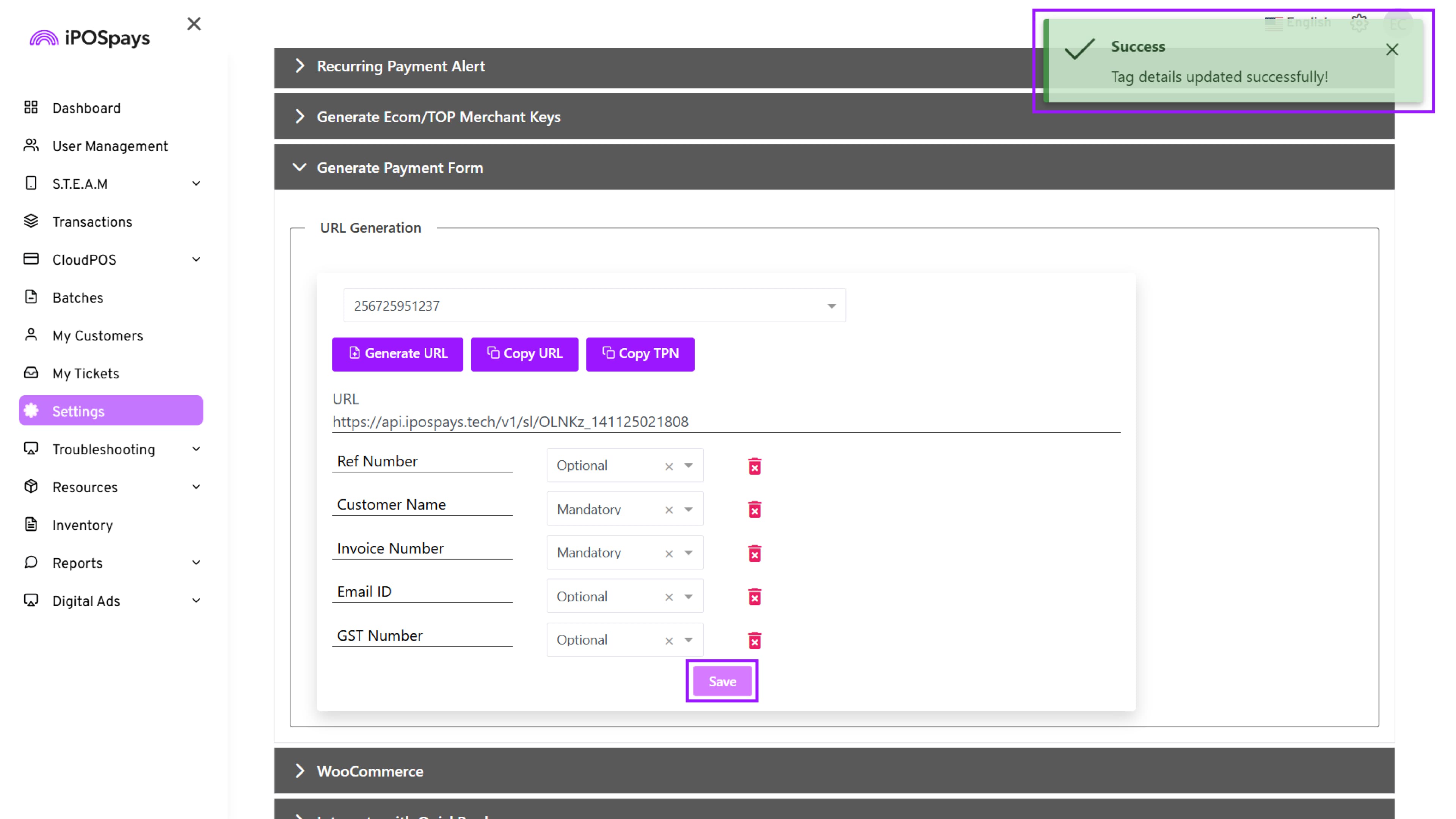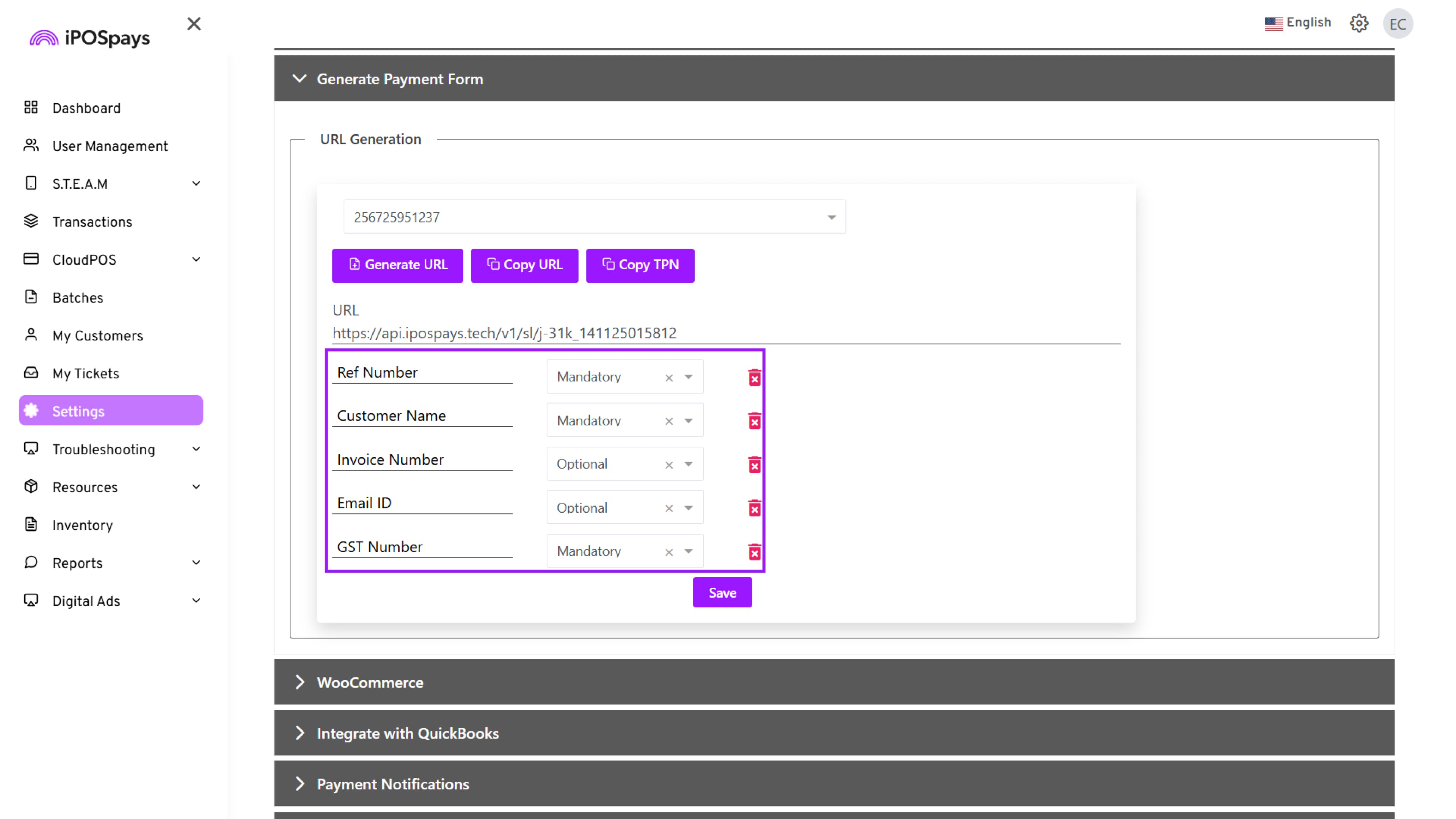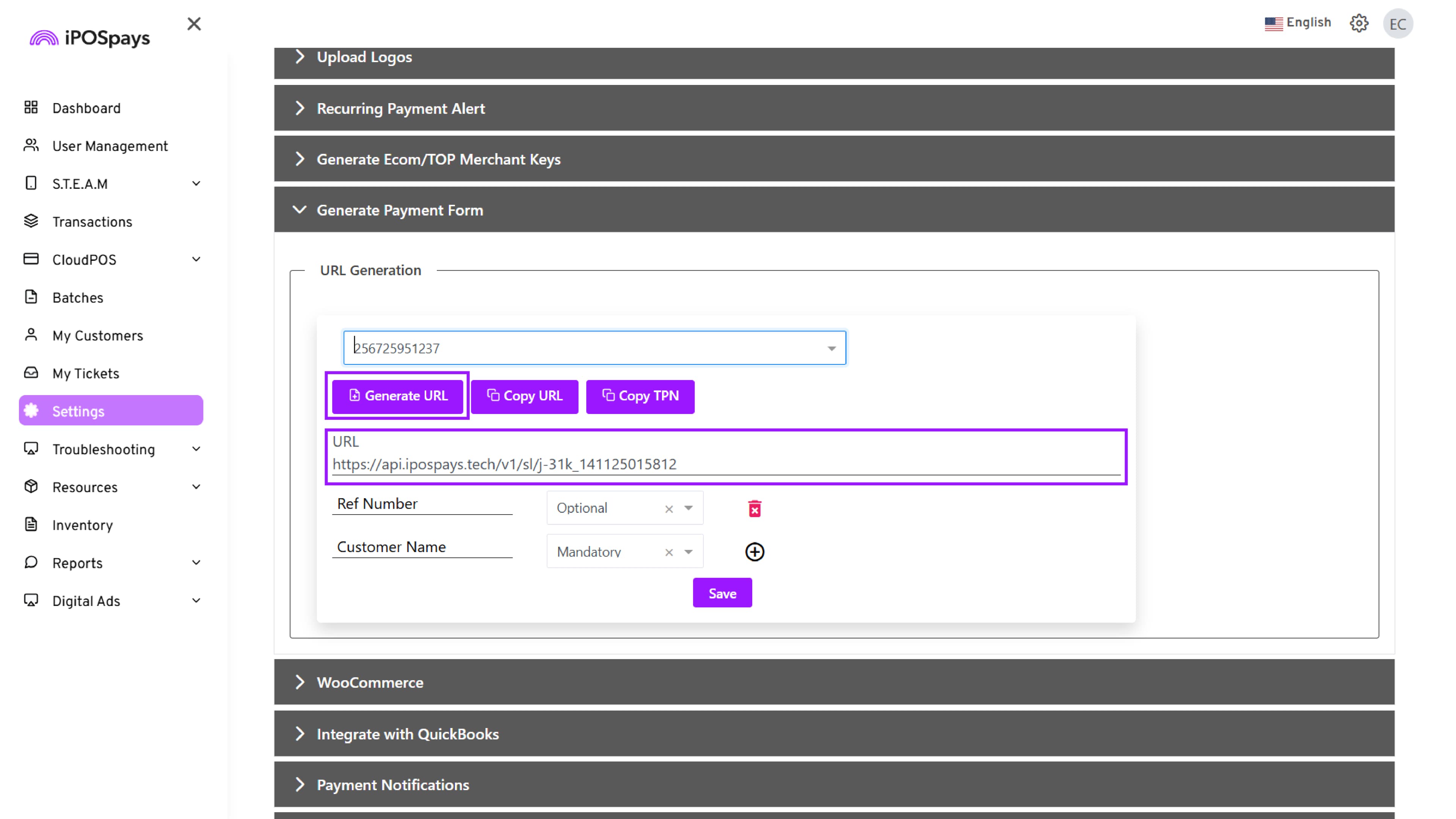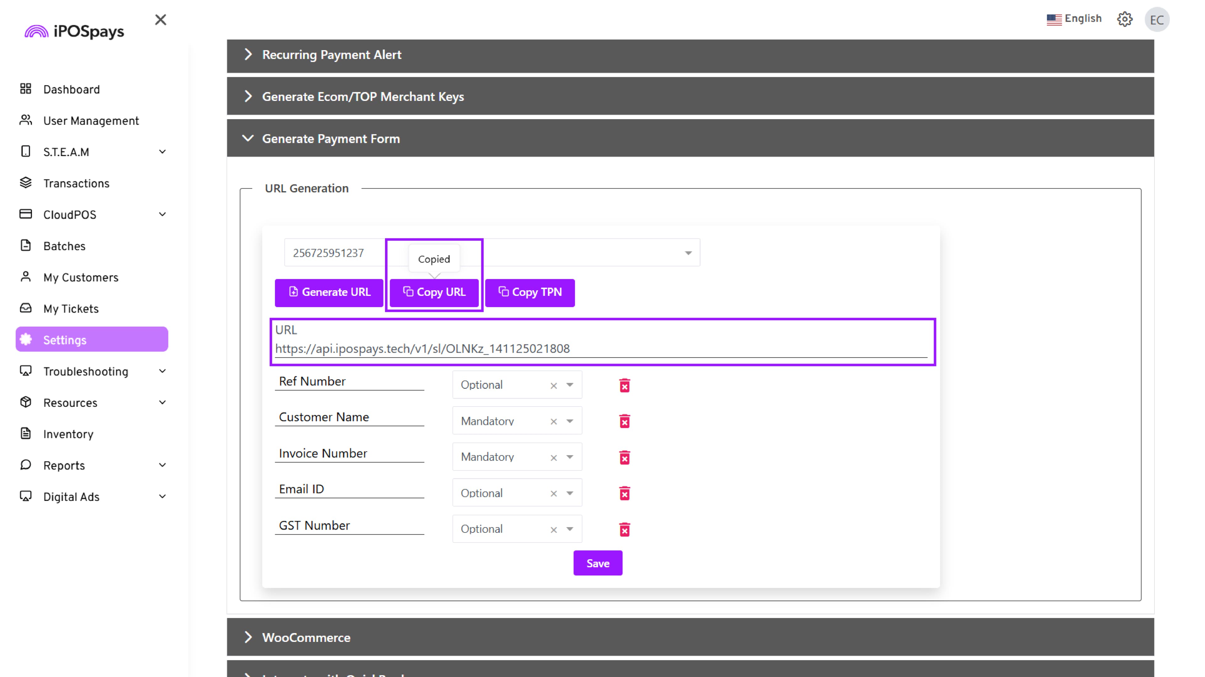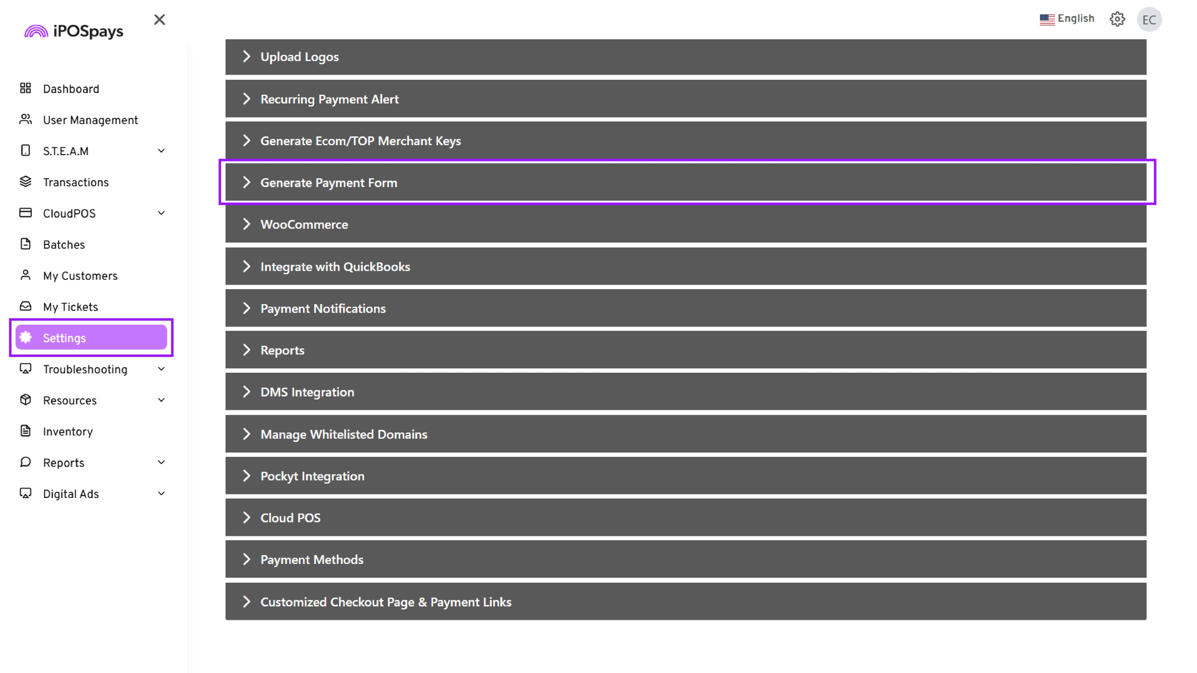 Navigate to Settings, Click → Generate Payment Form.