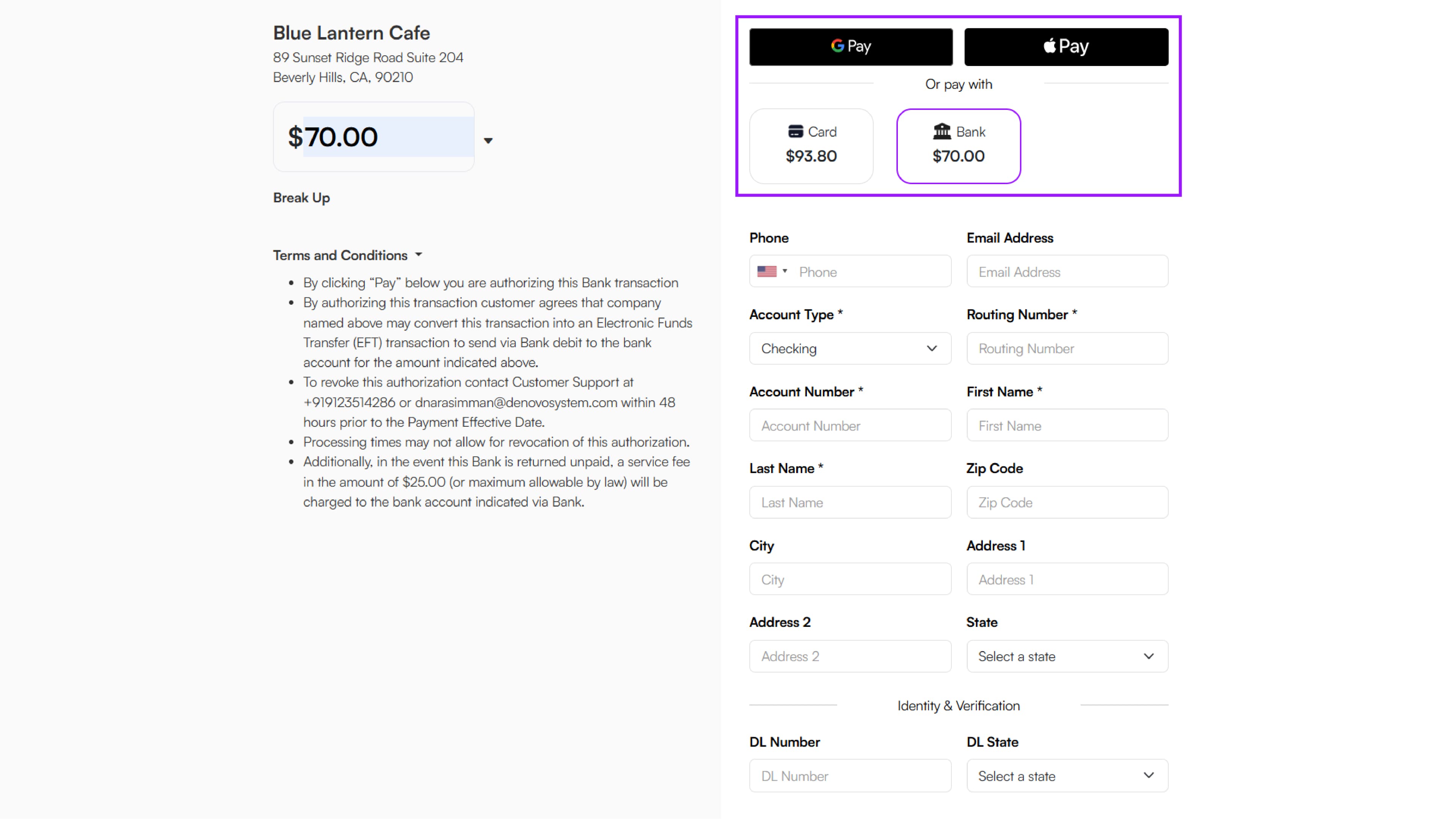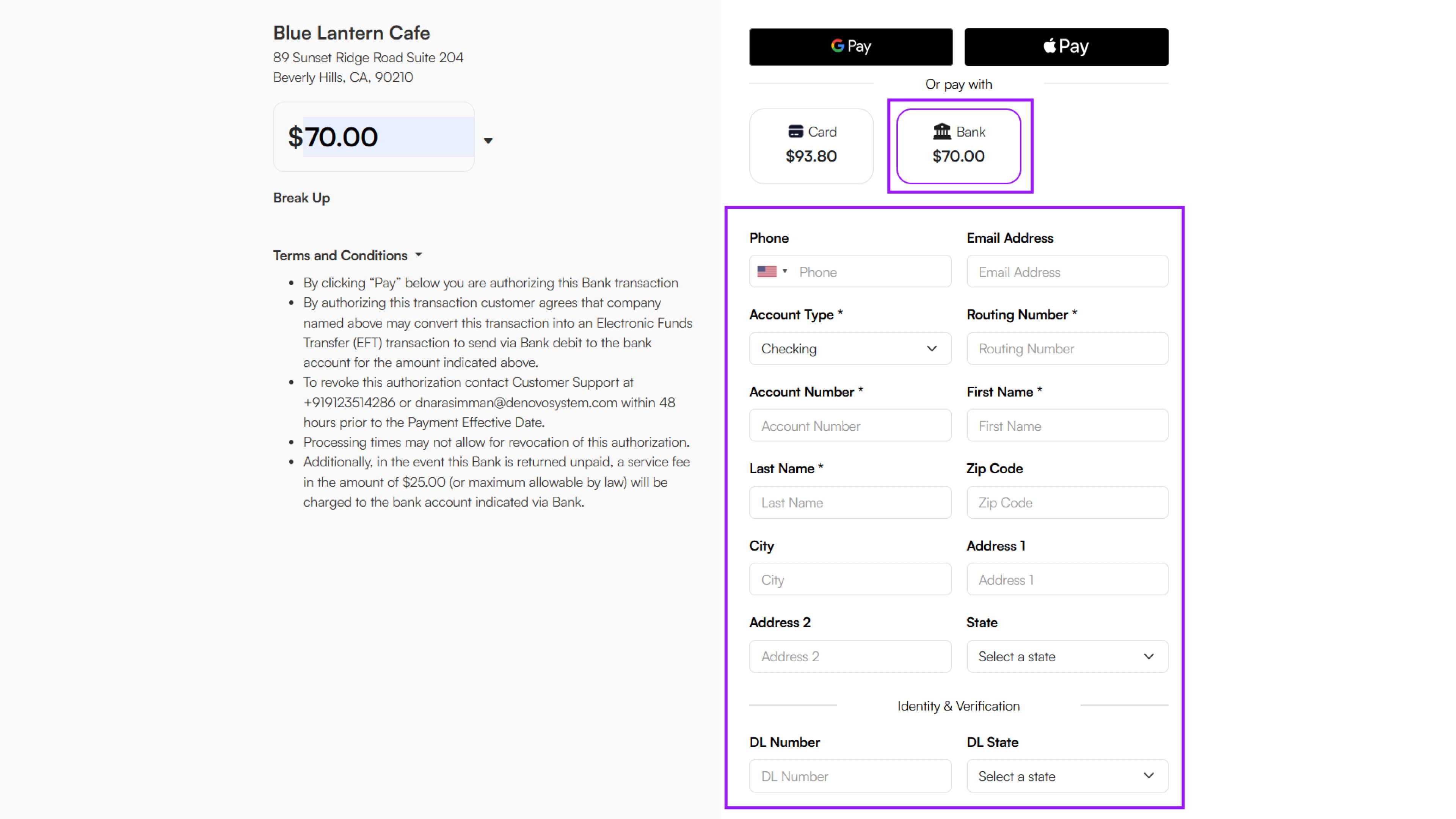 - If the customer chooses Bank, they must enter the following details: