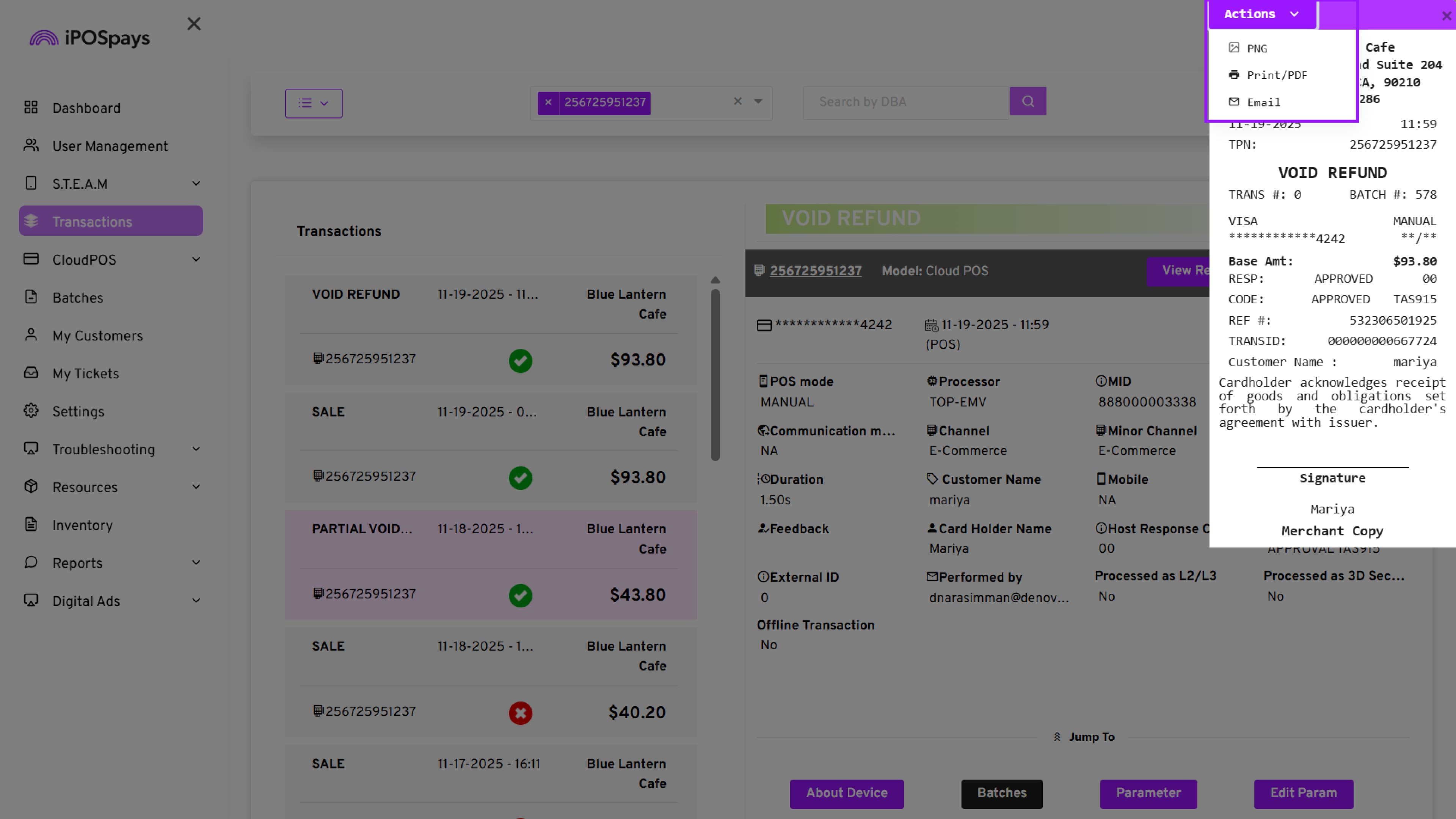 - If you click the Actions button on the receipt, you will see three options: