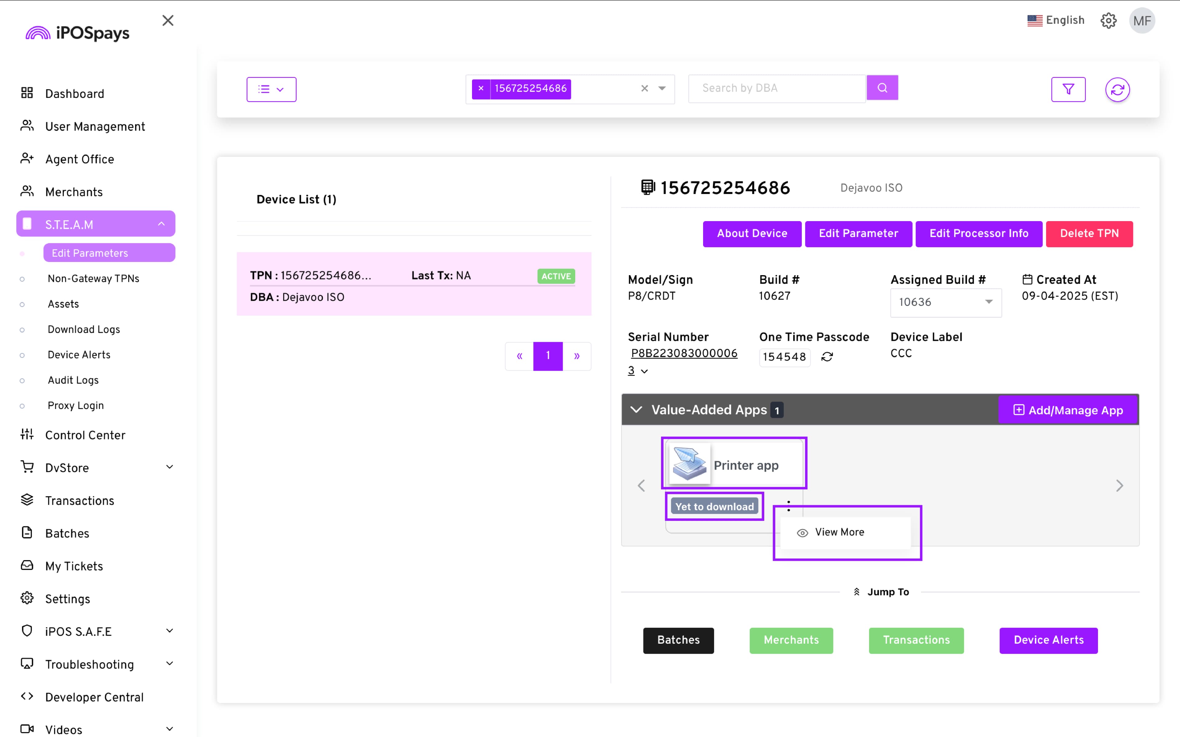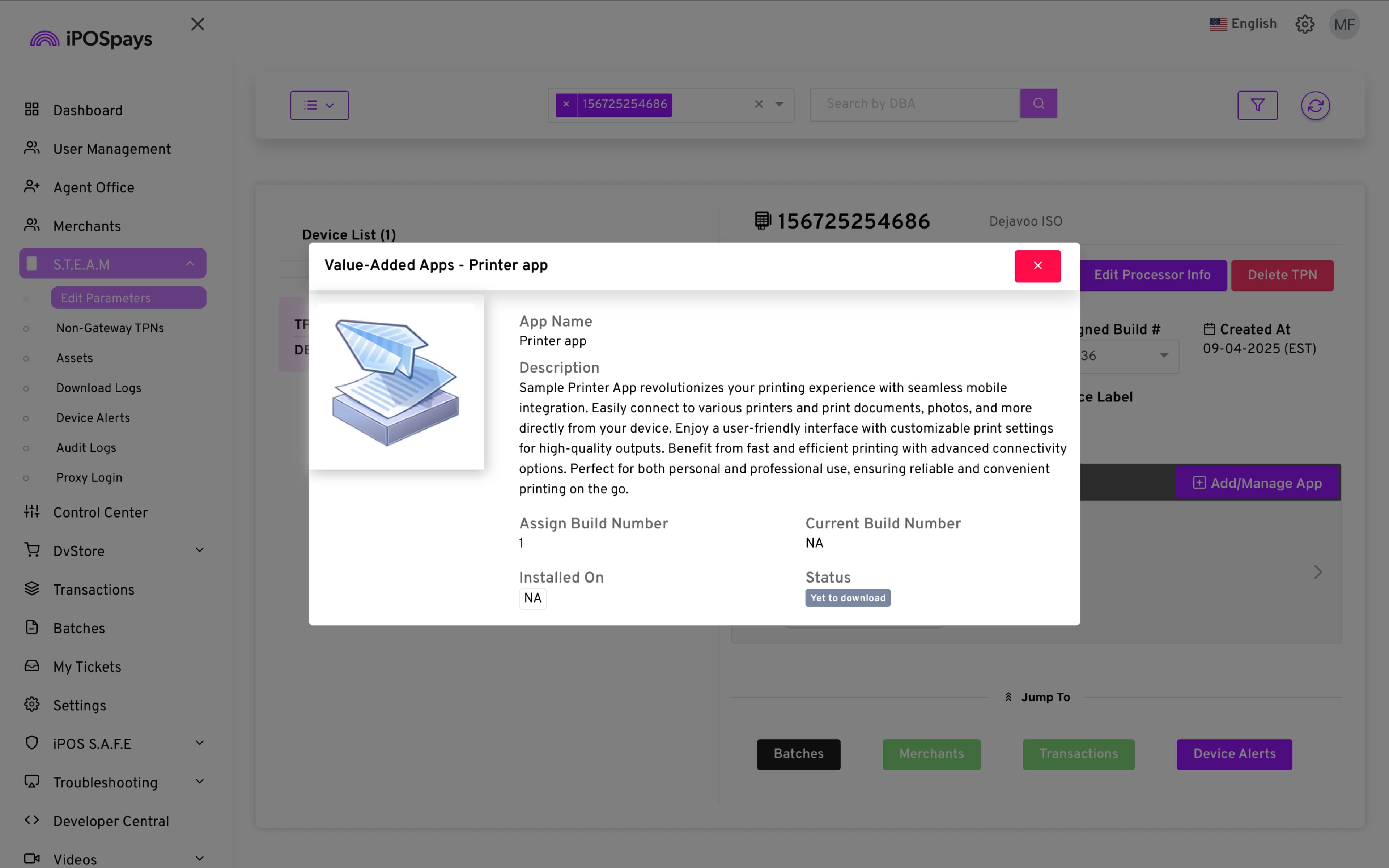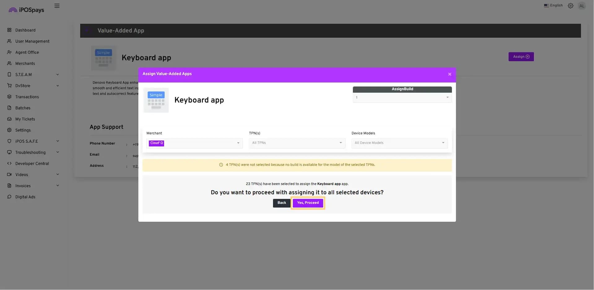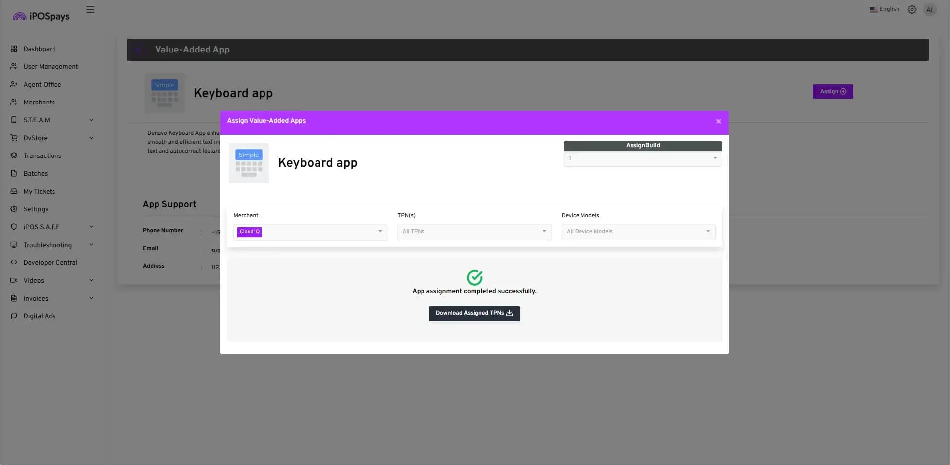 Click on Assign → Choose the merchant, TPN, and device for which you wish to assign the app. Alternatively, you can choose a merchant and assign it to all TPNs and device models as well.