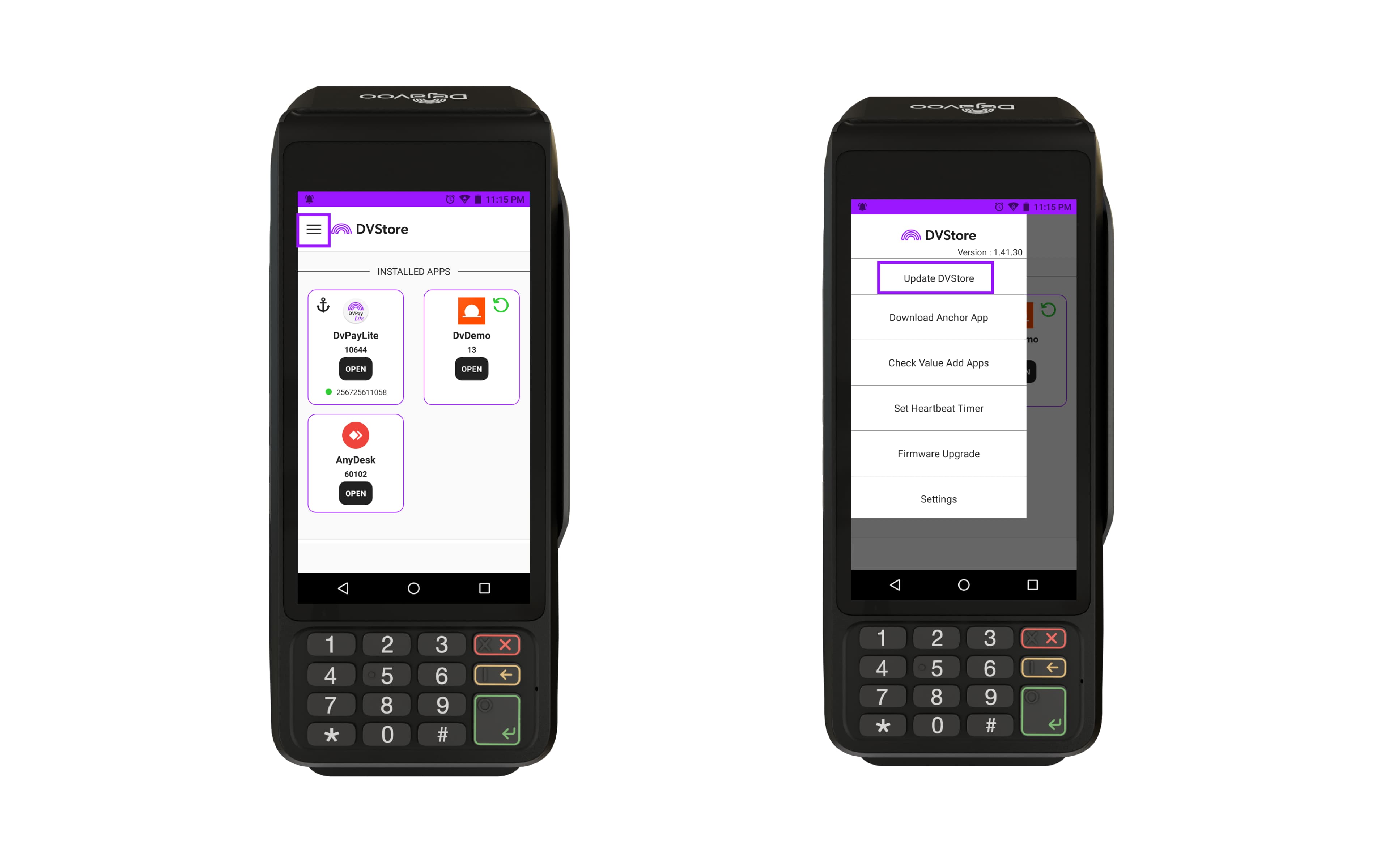 - To manually update DVStore, tap the menu icon in the top left corner → Update DVStore.