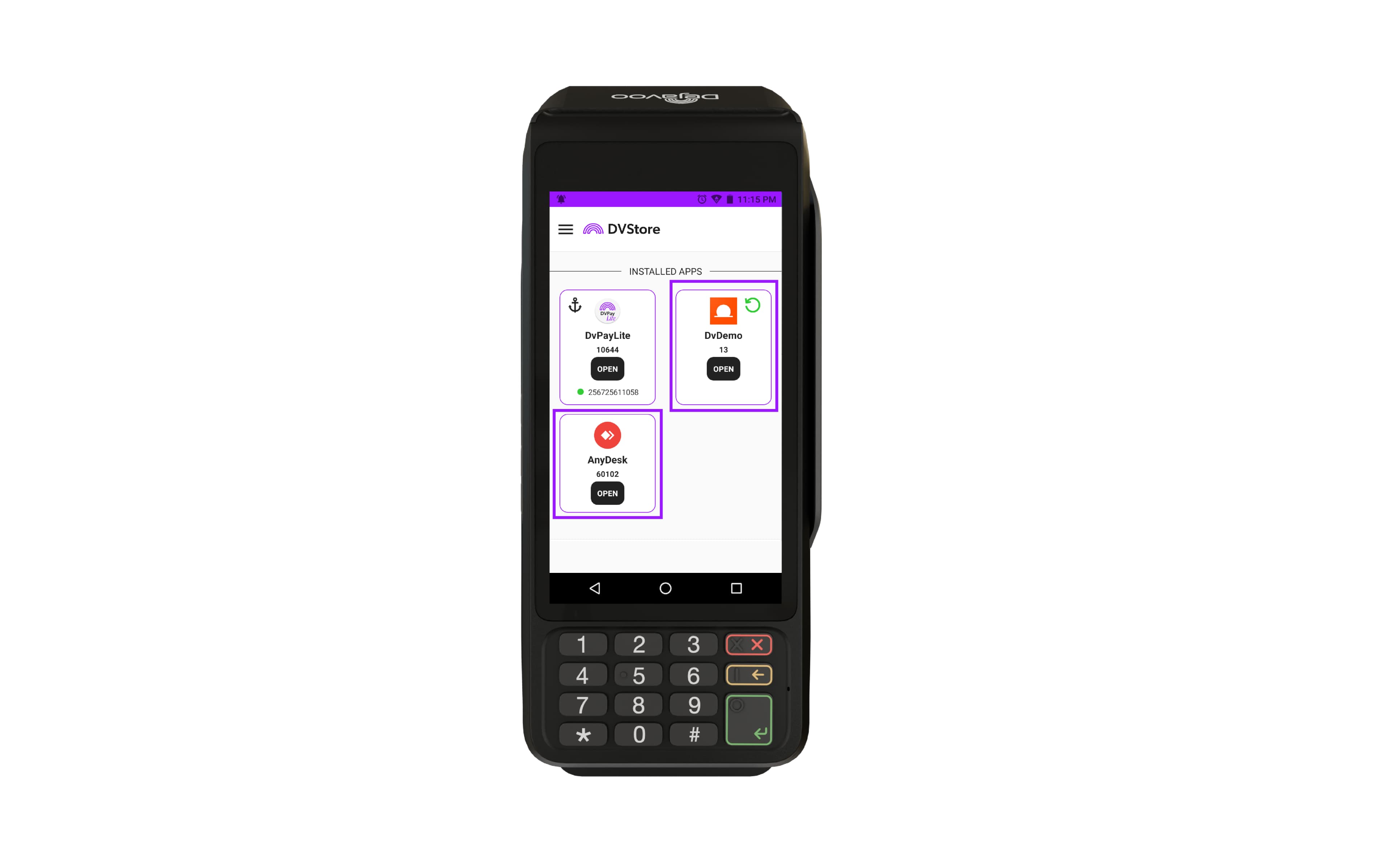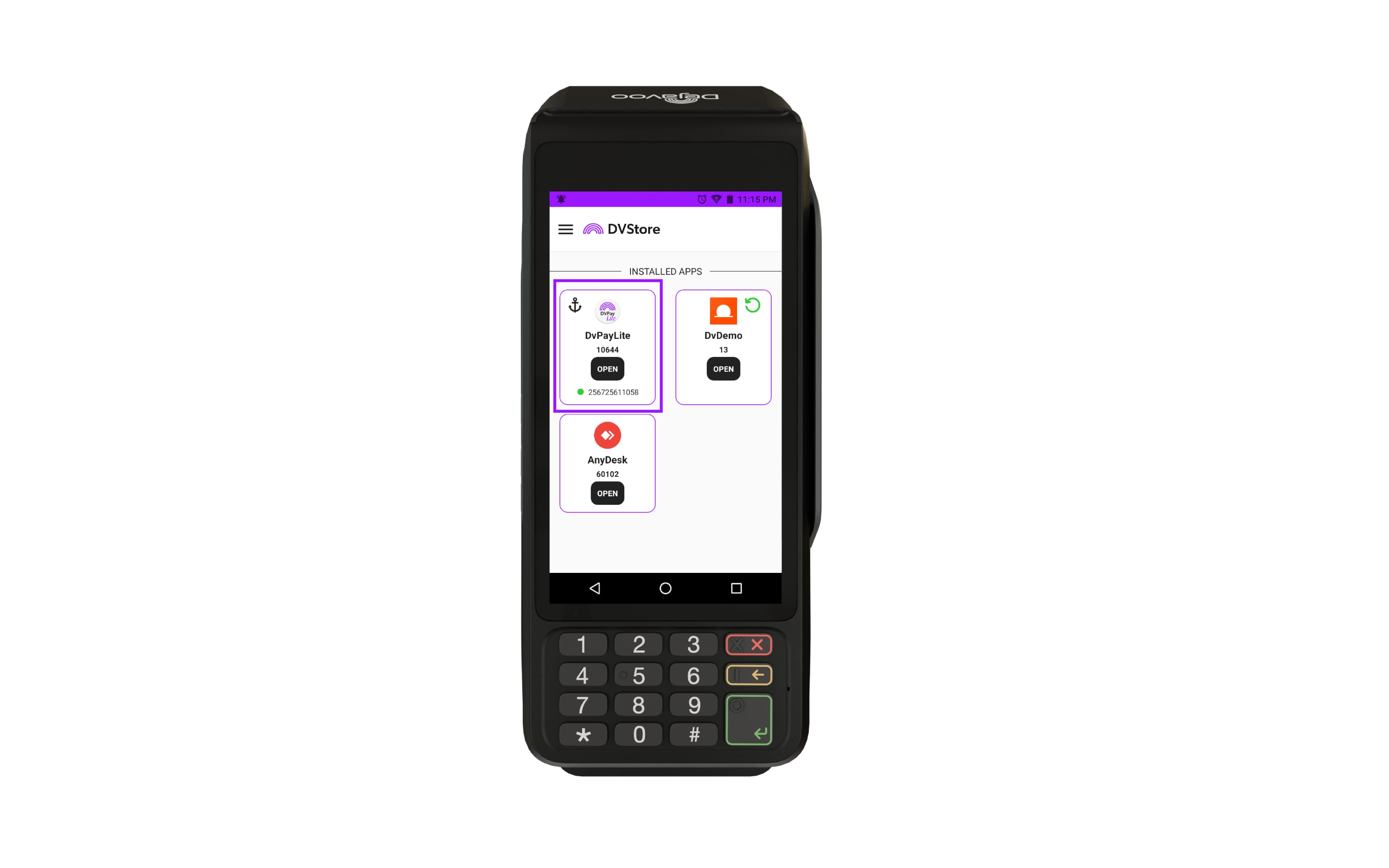 Once updated, the terminal reboots and the new app appears on the DVStore home screen. The anchor app will the anchor icon ⚓ next to it.