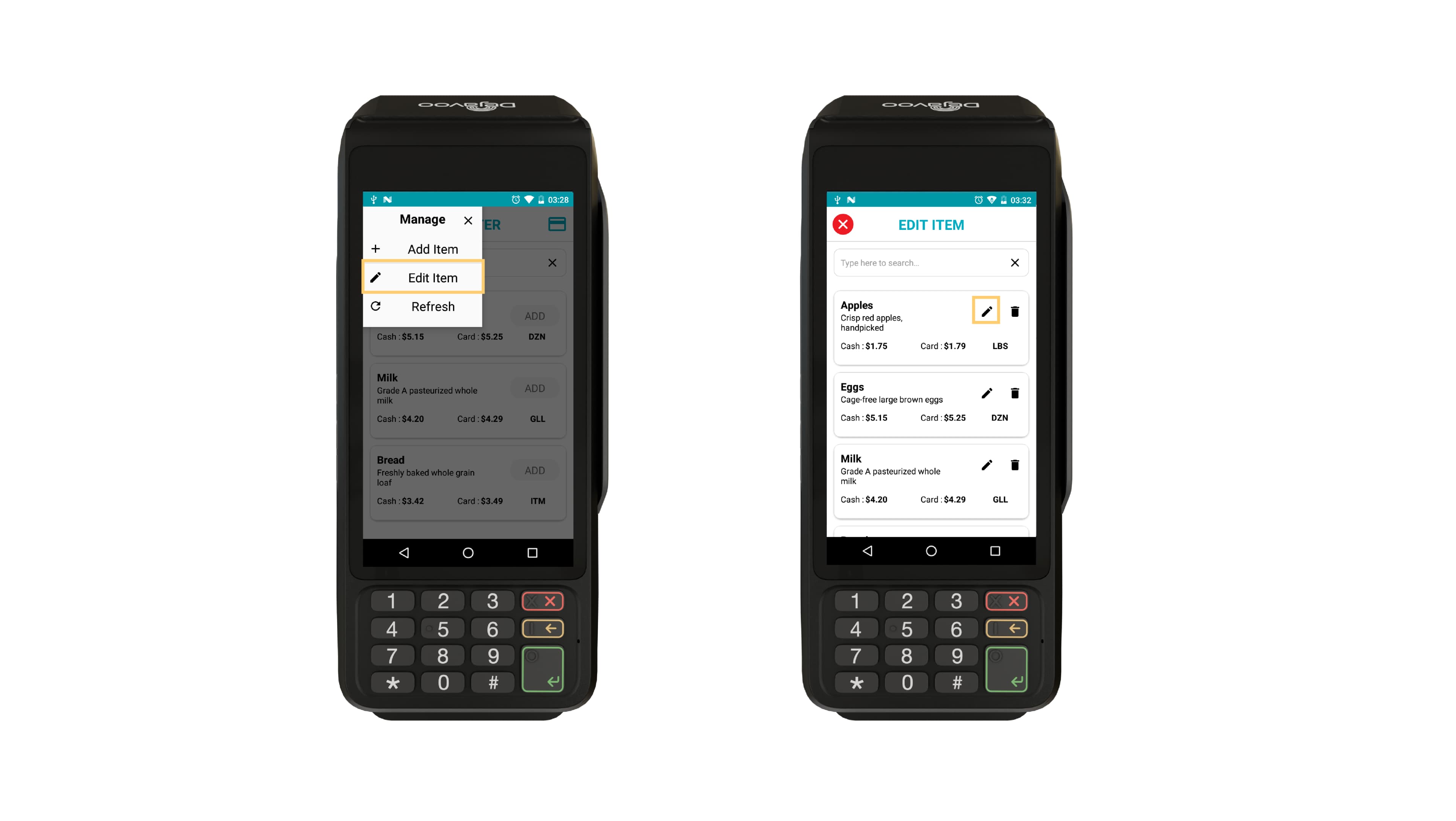 Add products manually or by scanning barcodes (If using a Dejavoo device with a built-in scanner or the camera of their iPhone)