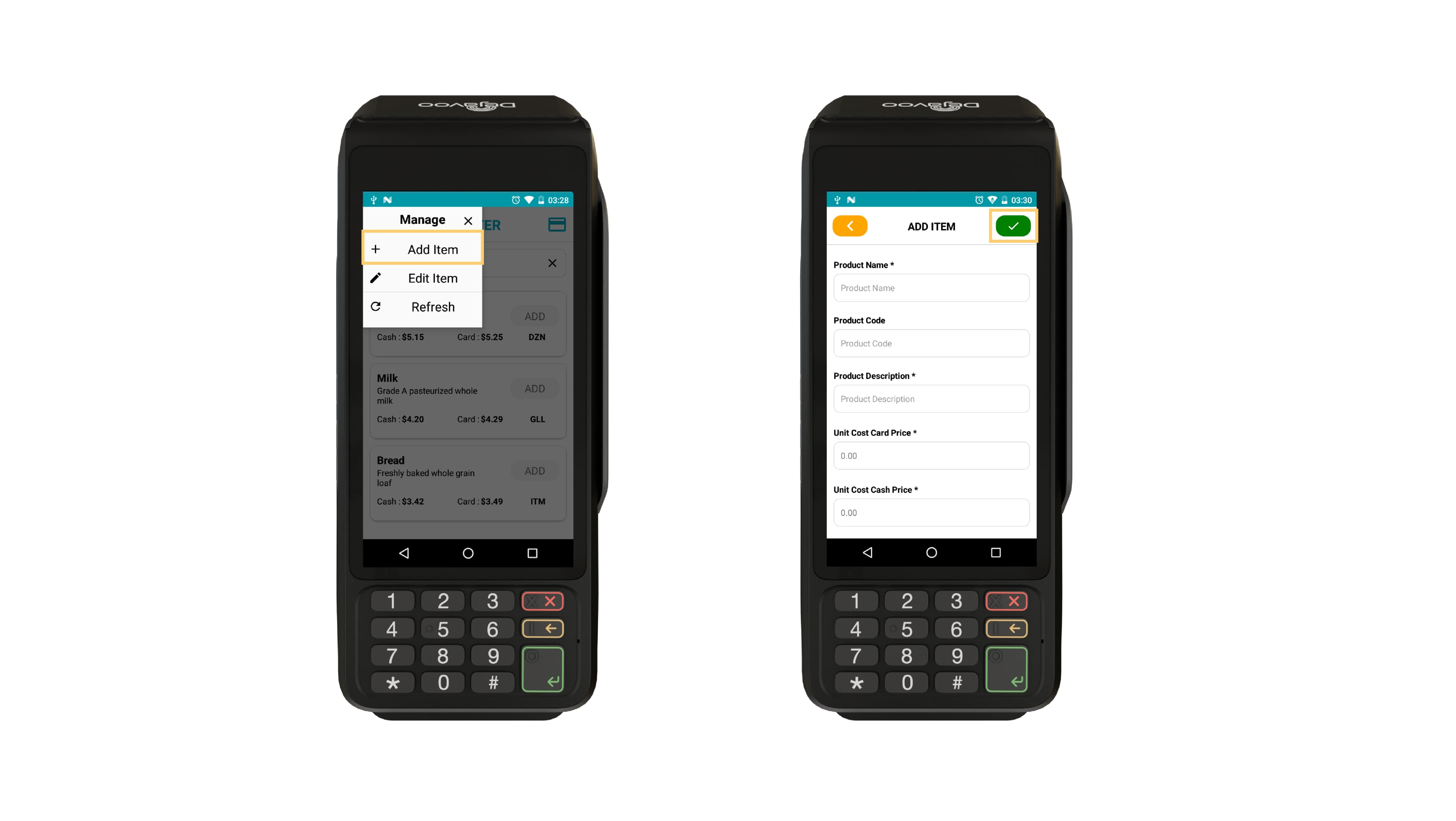 - Tap ✅ to save the item to the terminal’s inventory