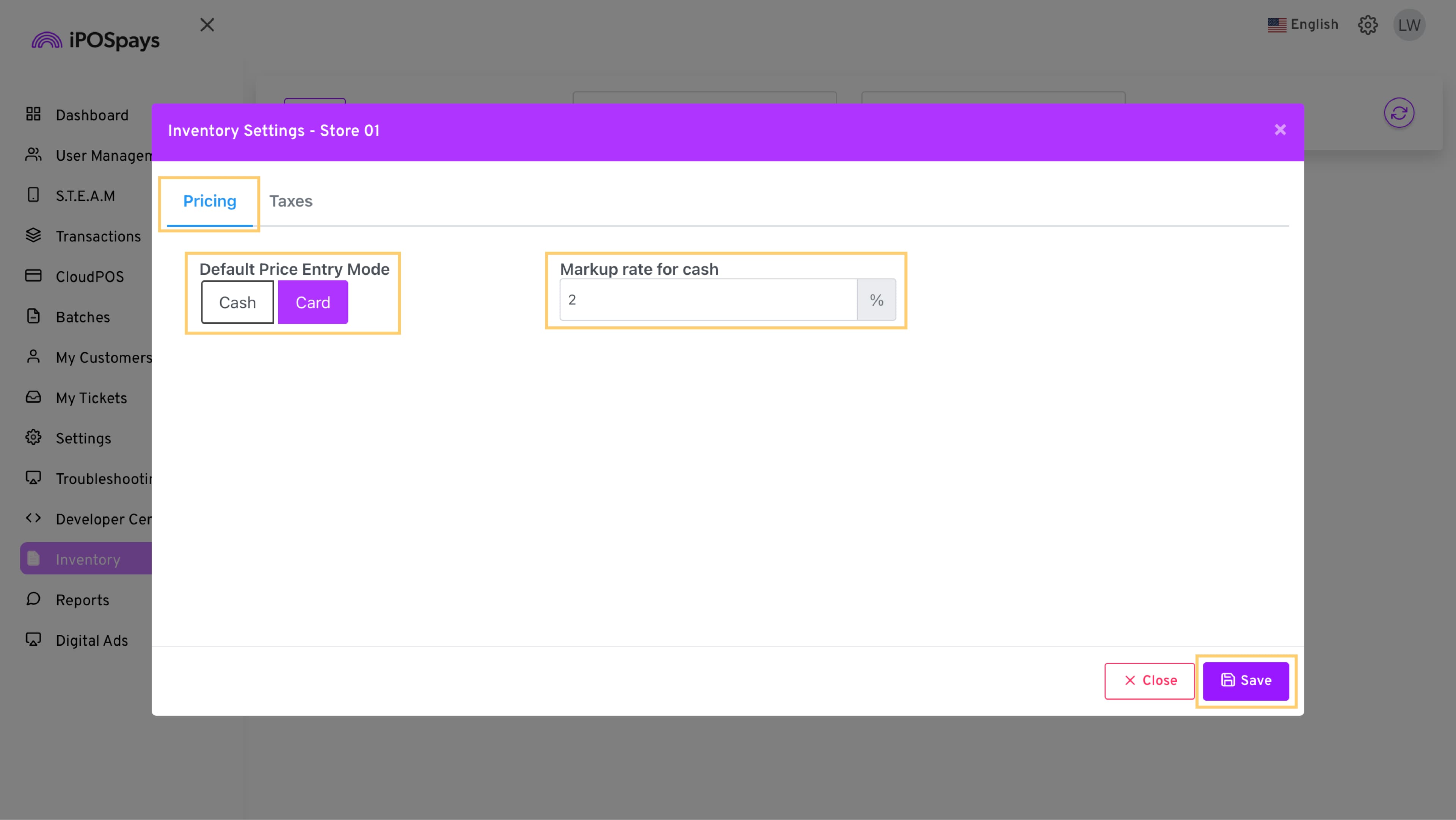 - Under Inventory Settings → Pricing, set the Default Price Entry Mode: