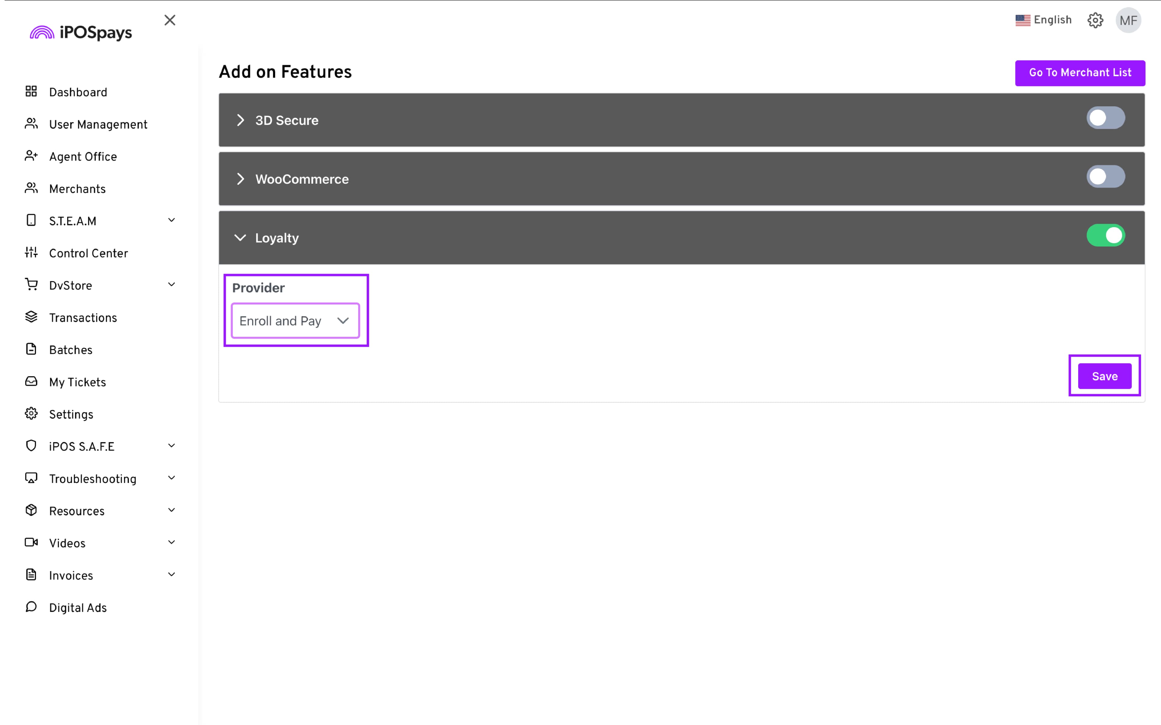 Go to Merchants → Search and select the merchant → Store DBA → Add-On Features.