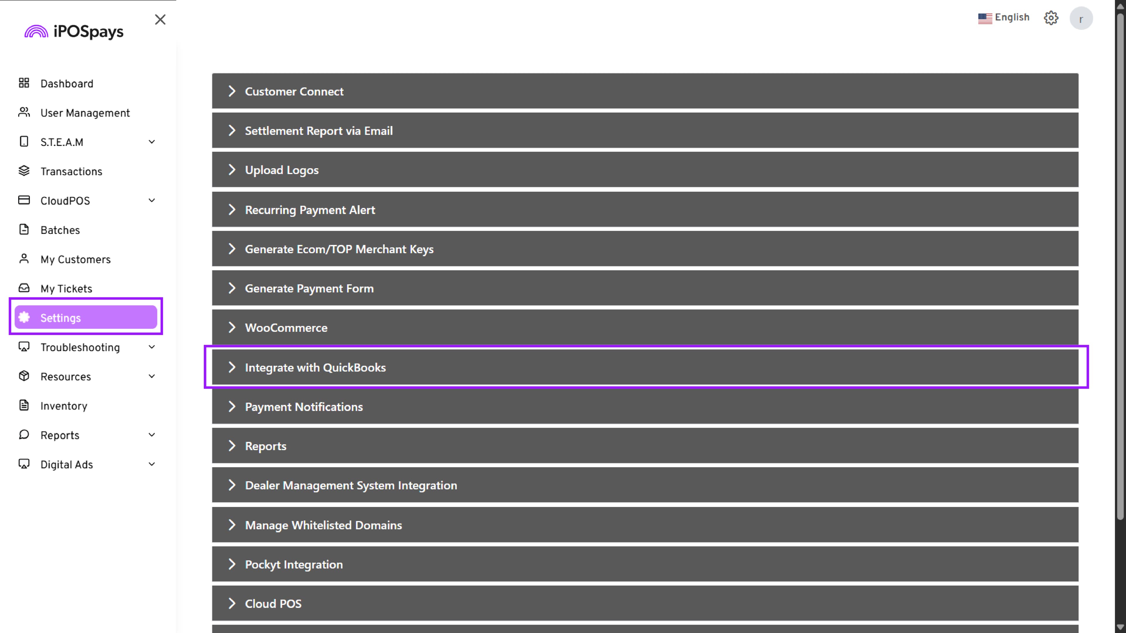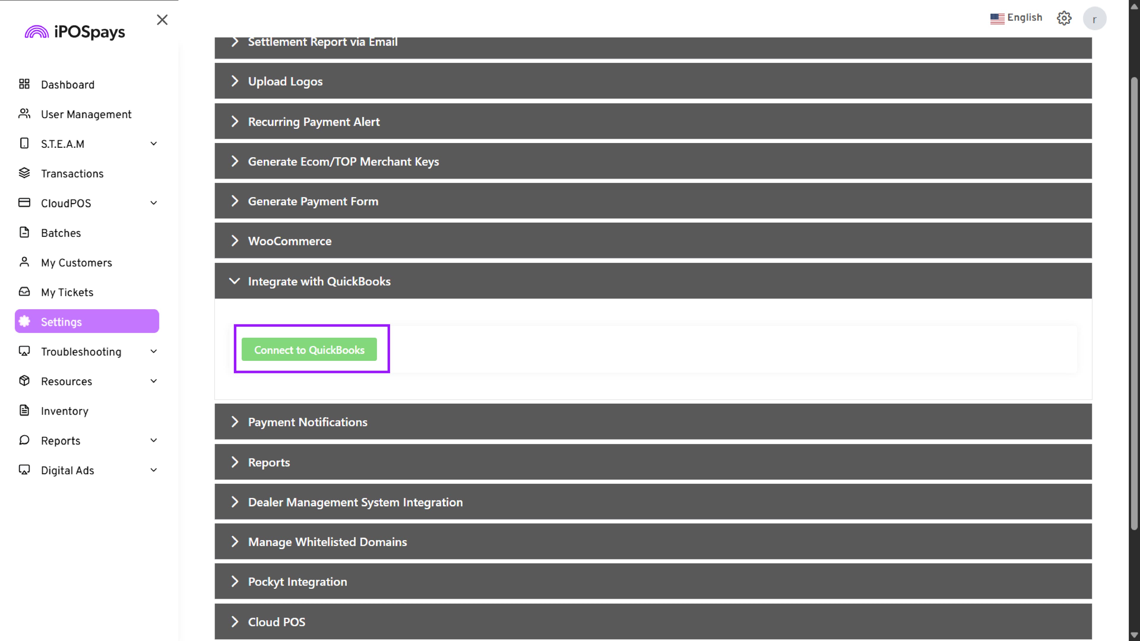 QuickBooks Integration must be enabled for the merchant account and applies to all associated TPNs, including Payment Terminal (POS) TPNs and CloudPOS TPNs. If this feature is not enabled, contact your ISO to activate QuickBooks Integration for the merchant account.