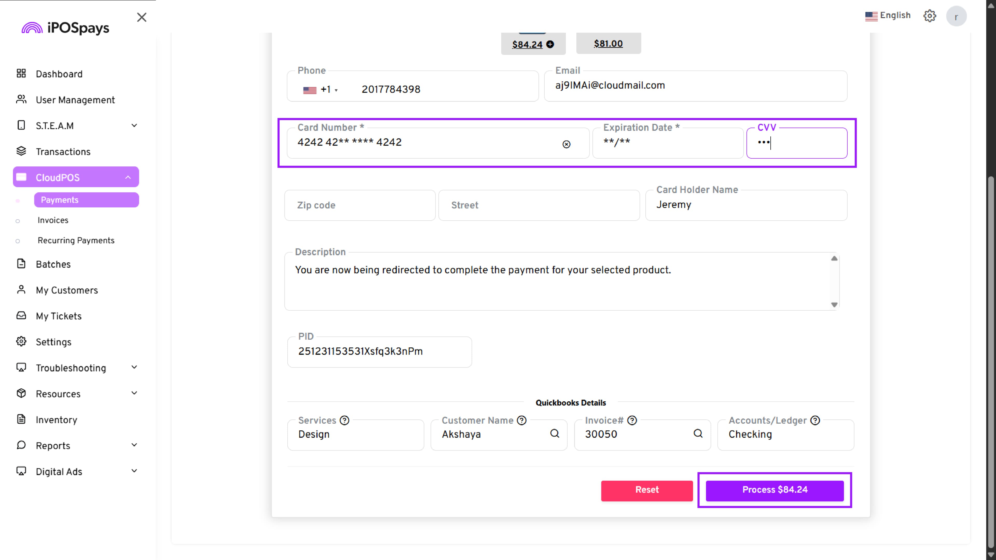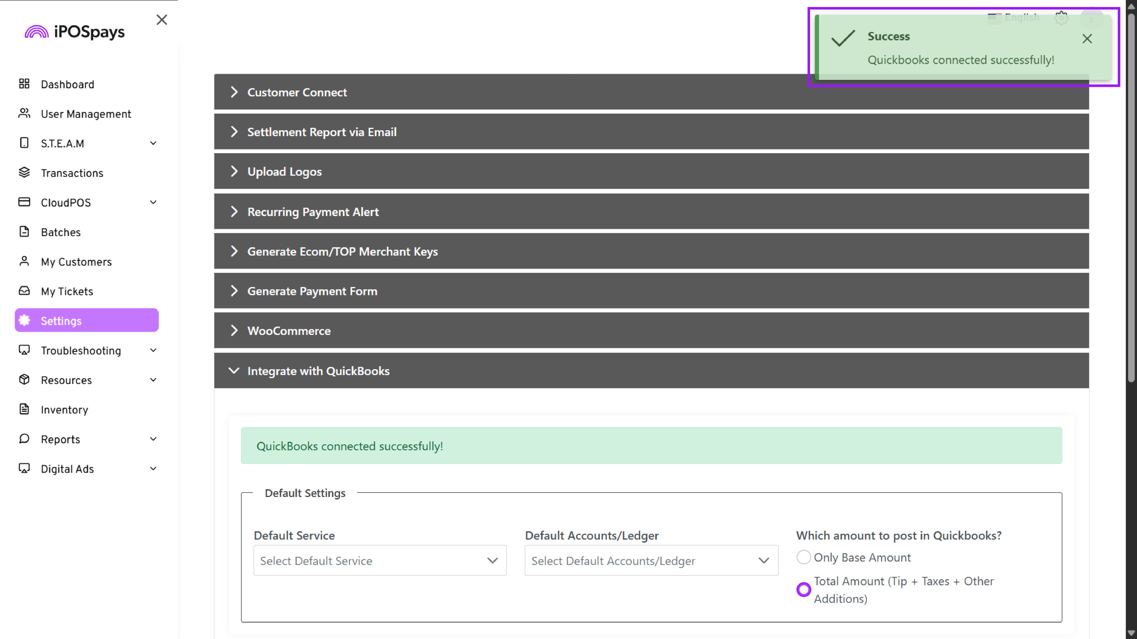 The QuickBooks Integration feature in the iPOSpays Merchant Portal allows merchants to sync their payment transactions with their QuickBooks account seamlessly. Once enabled, all eligible transactions processed via Payment Terminals or CloudPOS will automatically be pushed to QuickBooks under the selected Service and Ledger. This integration eliminates manual bookkeeping, reduces errors, and ensures accurate financial reconciliation.