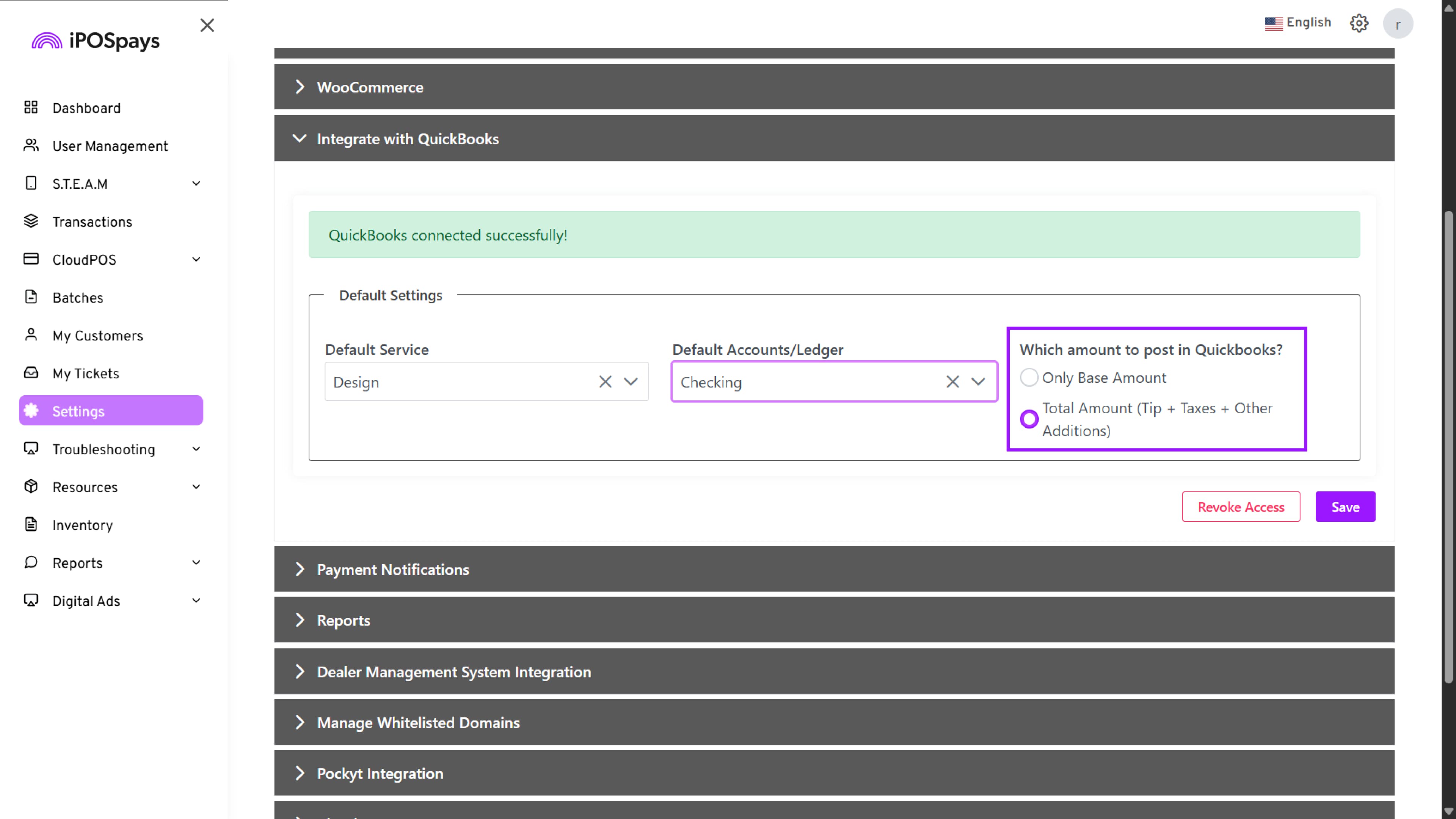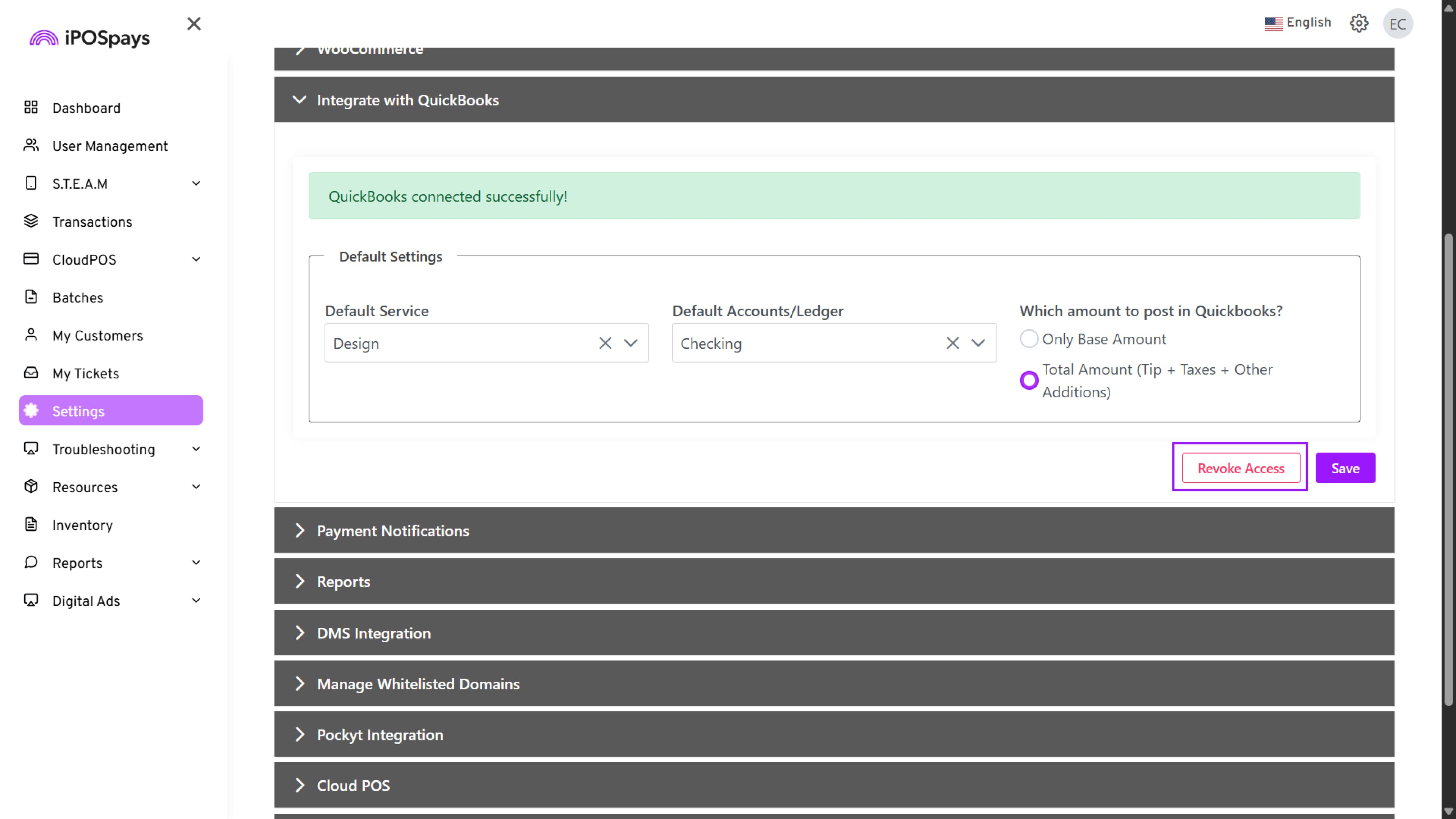 Select Revoke Access to disconnect the linked Quickbooks account from iPOSpays.