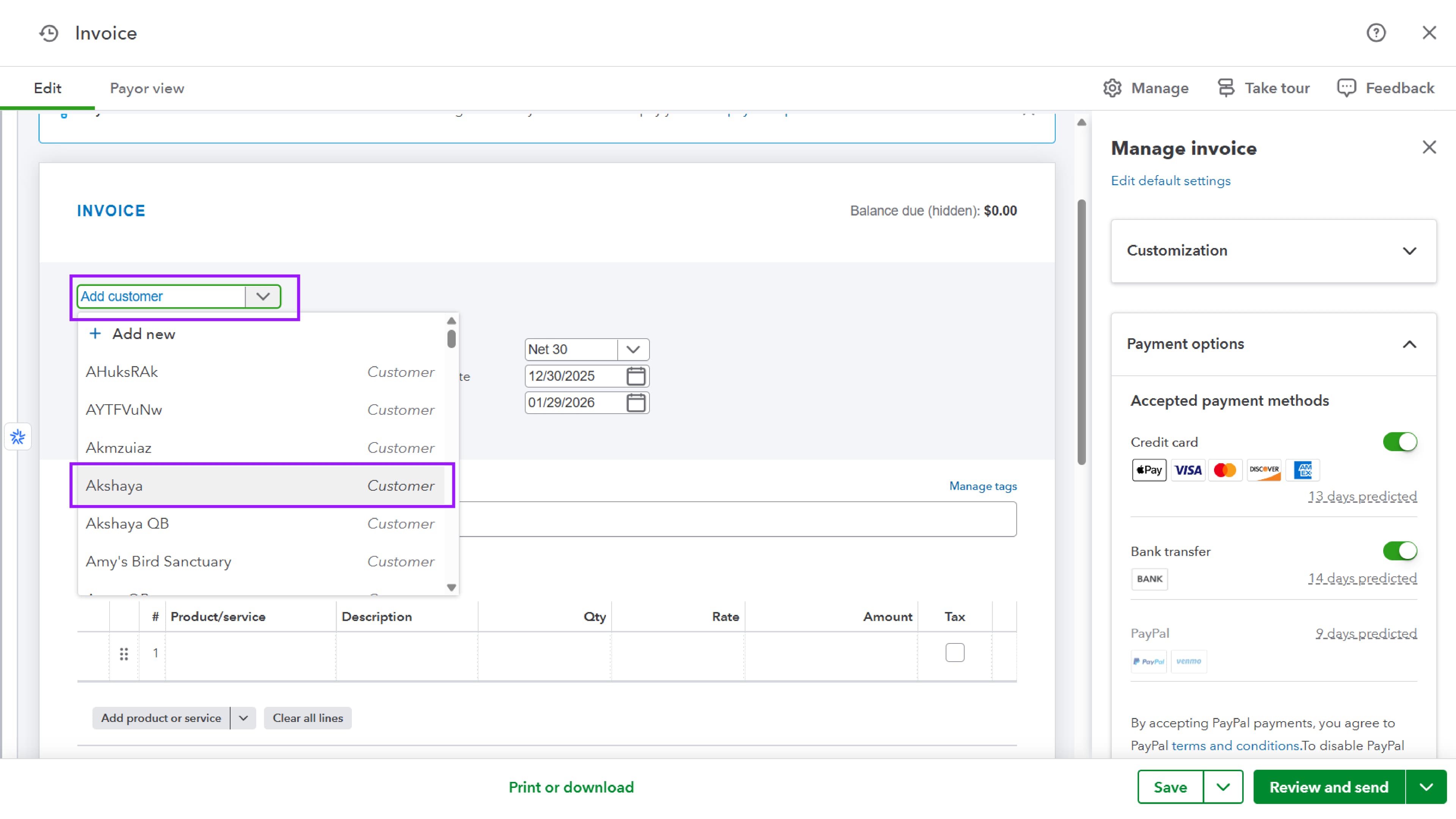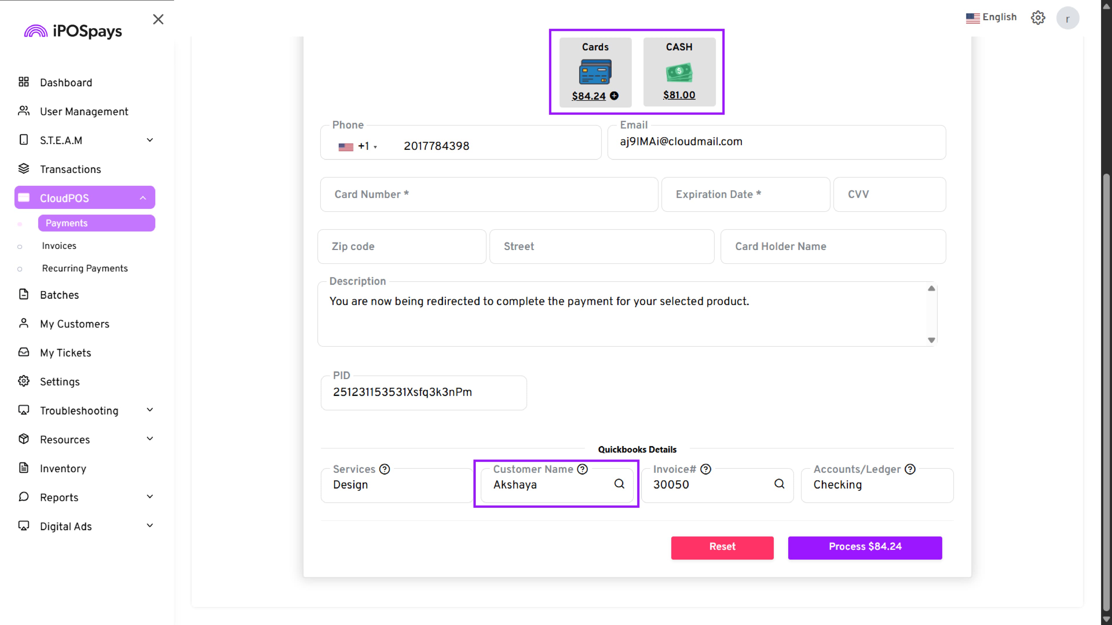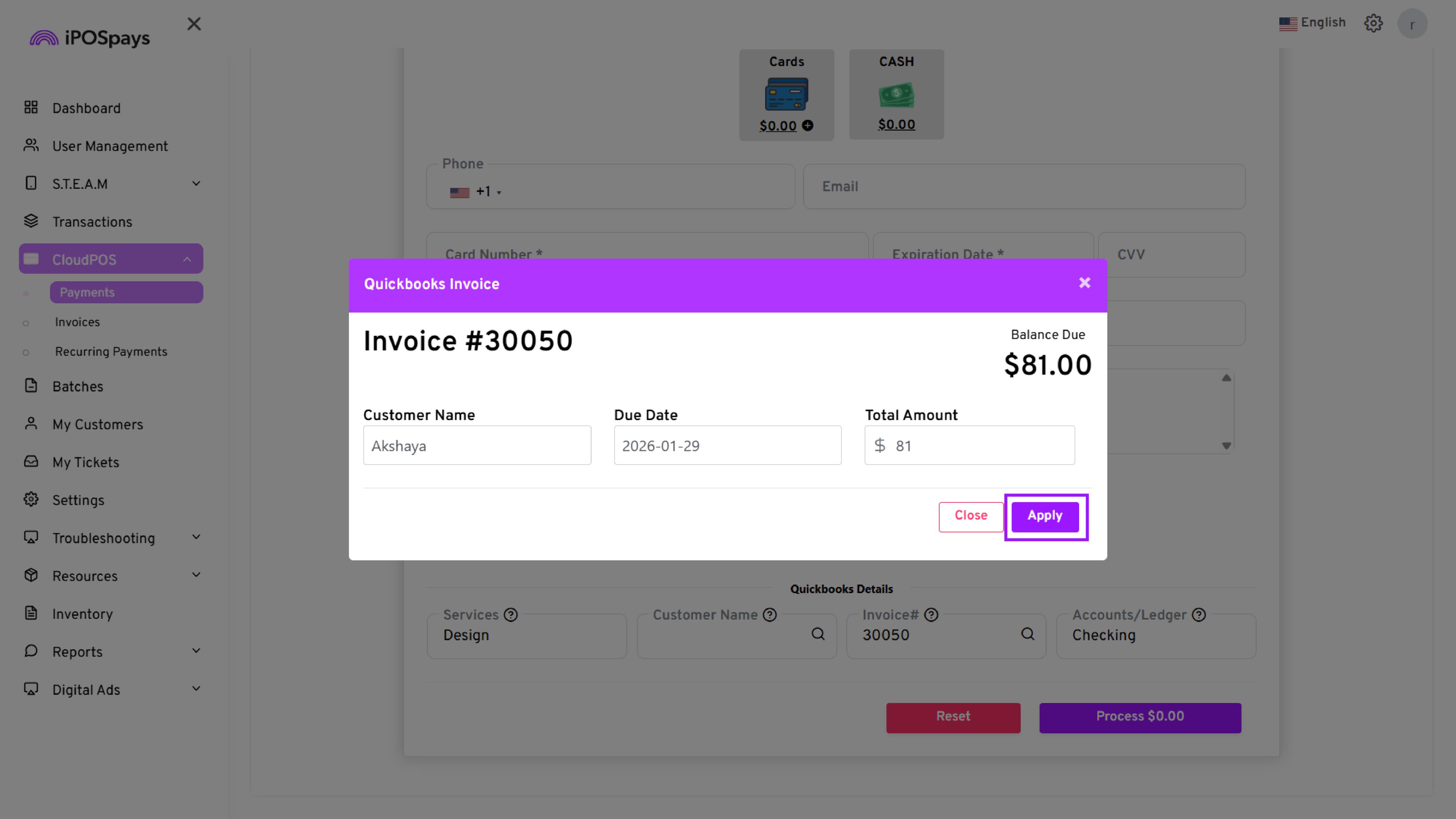- The Transaction amount and Customer Name are automatically populated based on the invoice details in QuickBooks.