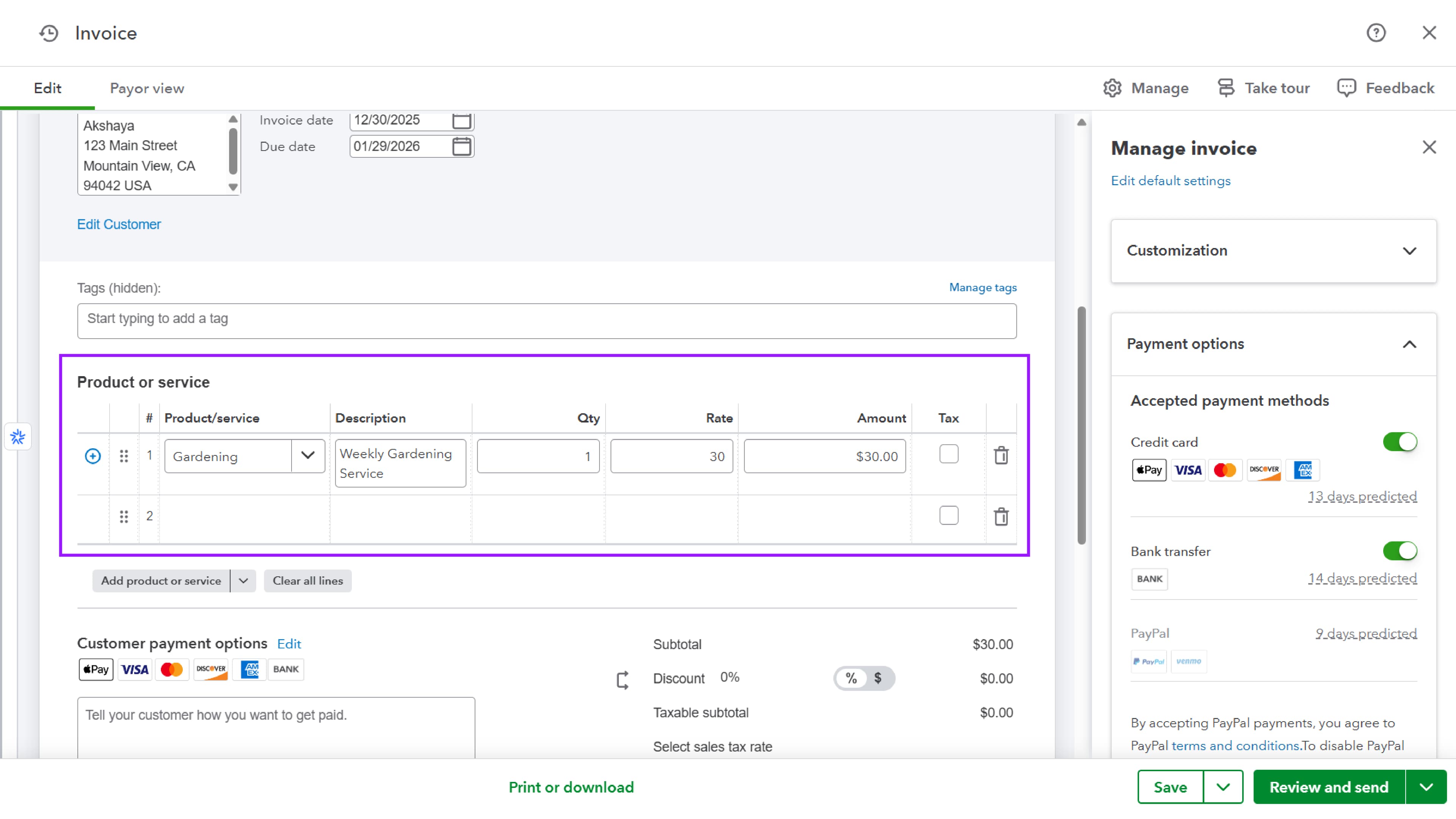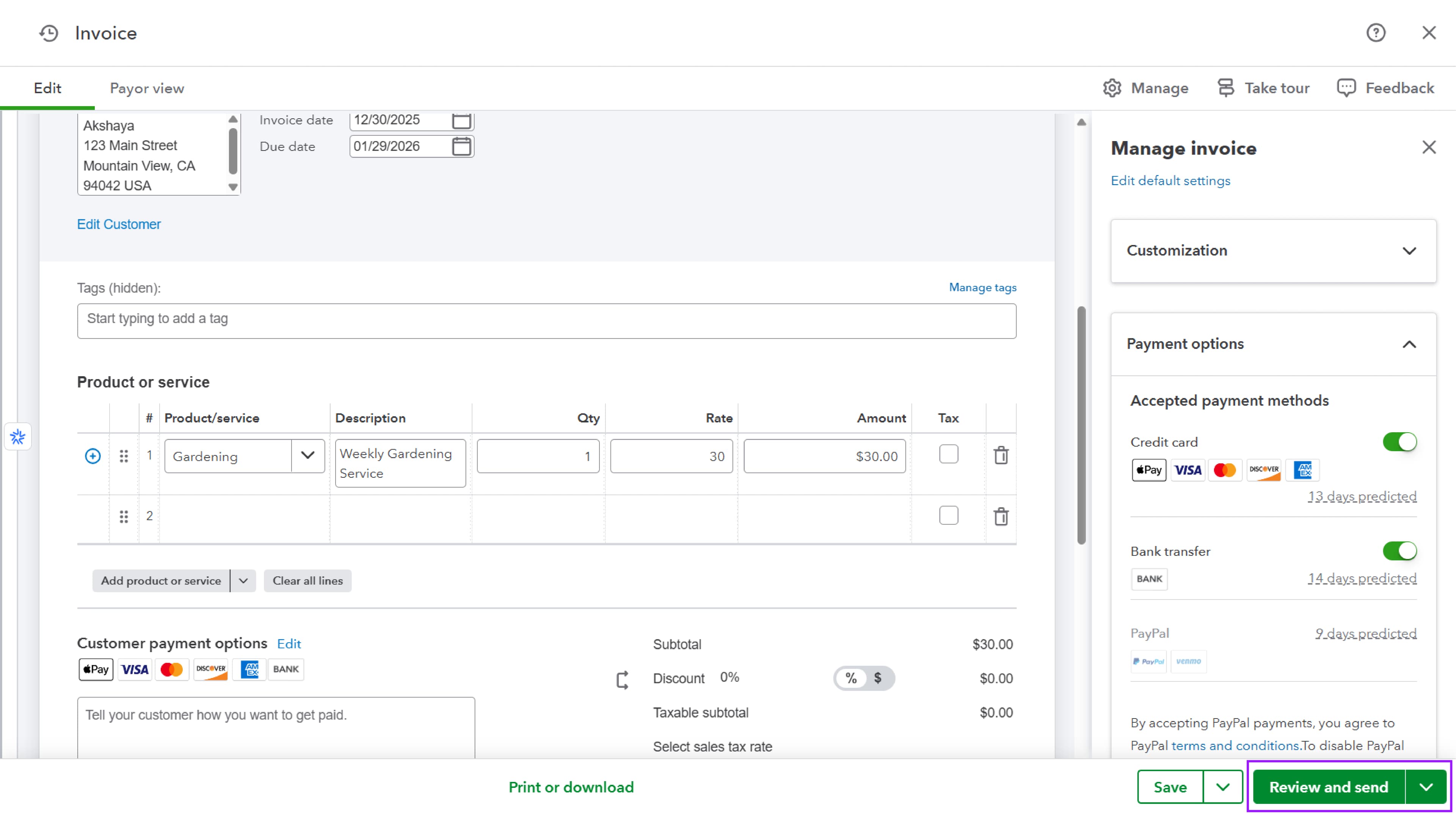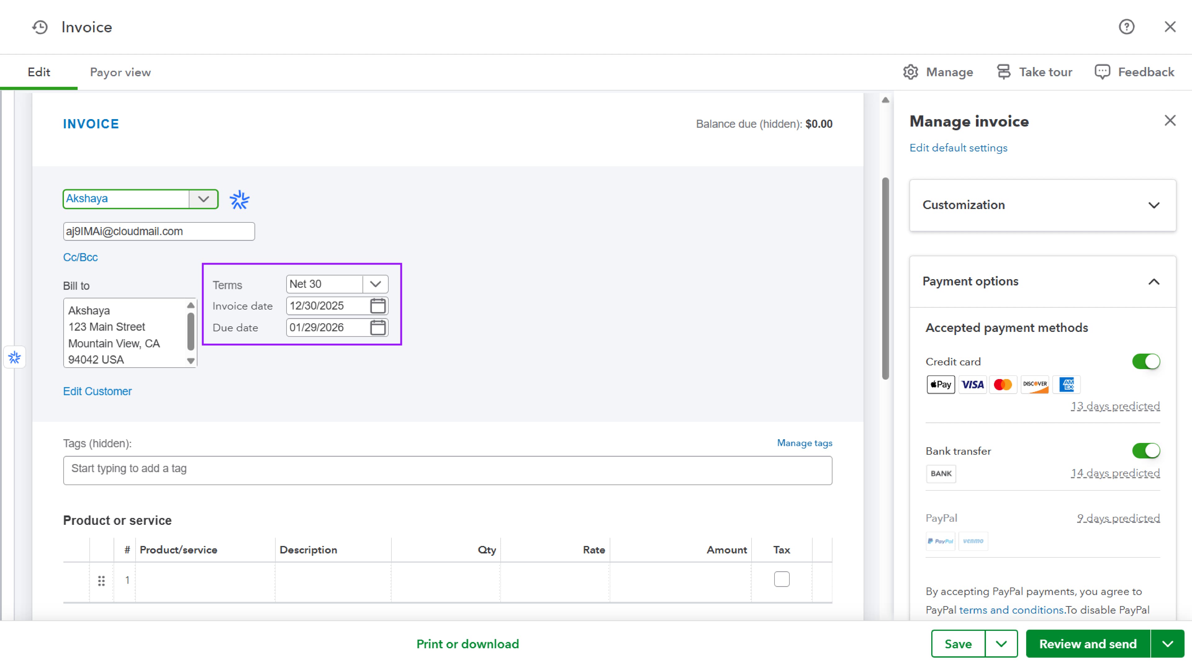 - The Transaction amount and Customer Name are automatically populated based on the invoice details in QuickBooks.