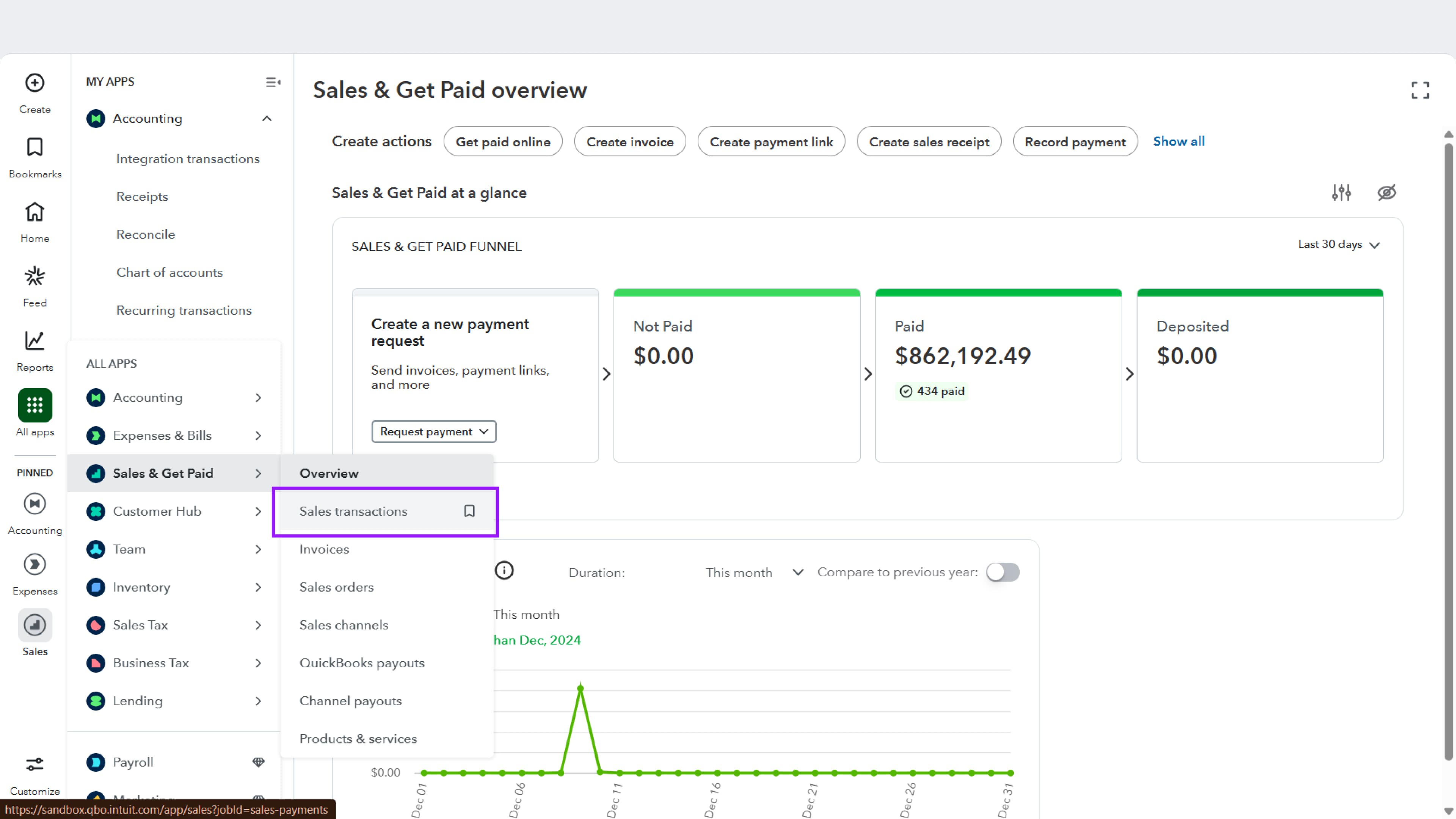 From the left-hand menu, click All apps, then go to: Sales & Get Paid → Sales transactions