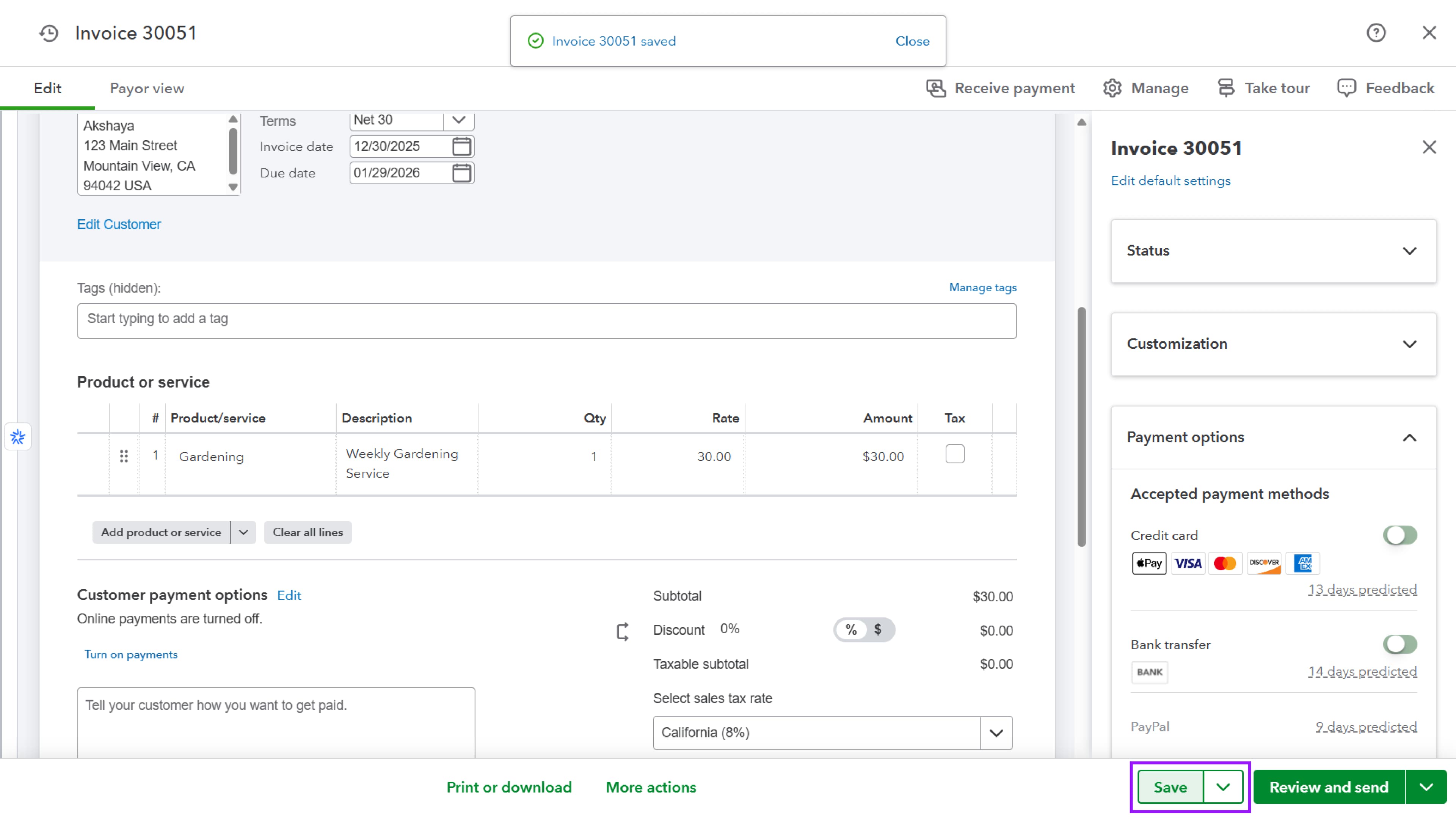A confirmation message appears indicating the invoice has been saved successfully, and an invoice number is generated.